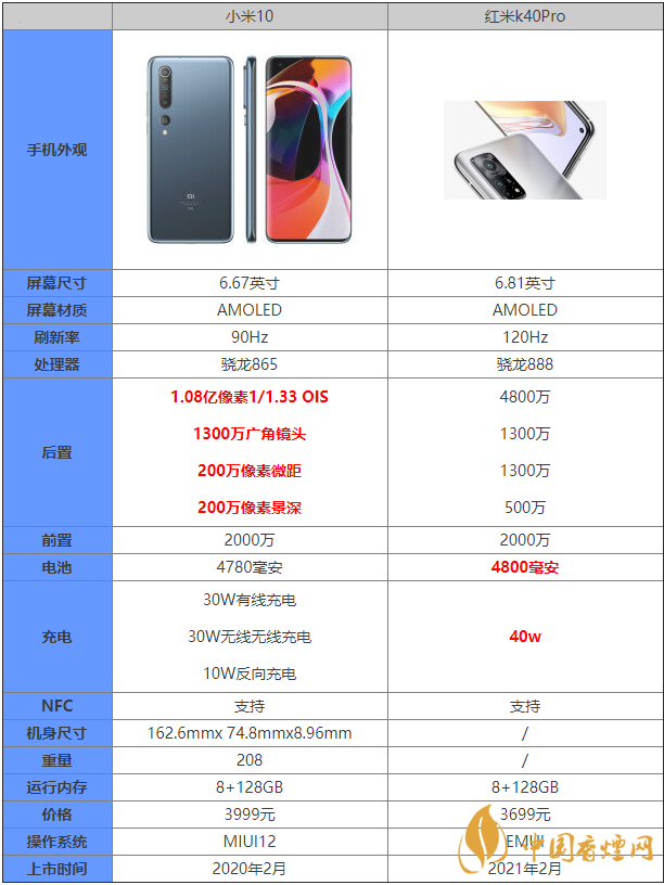 紅米k40pro和小米10都是大家比較關(guān)注的兩款手機,那么紅米k40pro和小米10有什么區(qū)別?哪款更值得入手?許多小伙伴都有這樣的疑問,接下來香煙網(wǎng)小編為大家?guī)碜钚碌膮?shù)配置對比,感興趣的朋友快來看看吧。