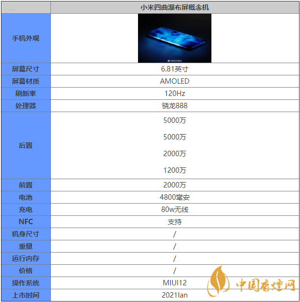 小米最近發(fā)布了一款小米四曲瀑布屏概念機,那么小米四曲瀑布屏概念機怎么樣?這款手機的具體的參數(shù)是什么?接下來香煙網(wǎng)小編為大家?guī)硇∶姿那俨计粮拍顧C參數(shù)配置詳情,快來看看吧。