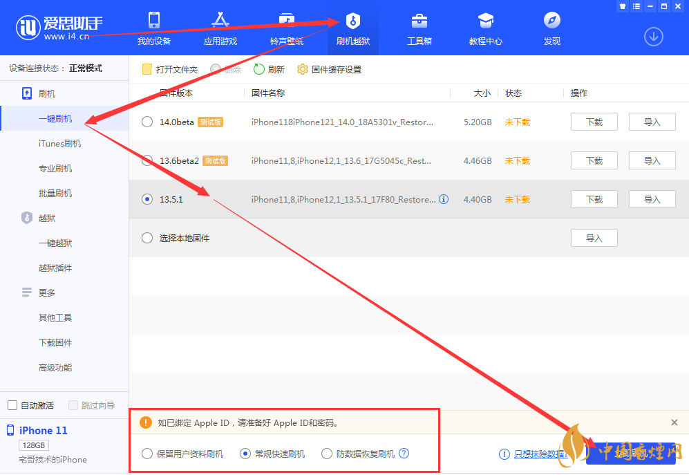 3.確認(rèn)數(shù)據(jù)備份成功之后,點(diǎn)擊上方“刷機(jī)越獄”進(jìn)入到“一鍵刷機(jī)”界面,選擇 iOS 13.5.1,勾選“常規(guī)快速刷機(jī)”,然后點(diǎn)“立即刷機(jī)”,之后愛思助手會(huì)自動(dòng)幫您下載固件并刷機(jī)。