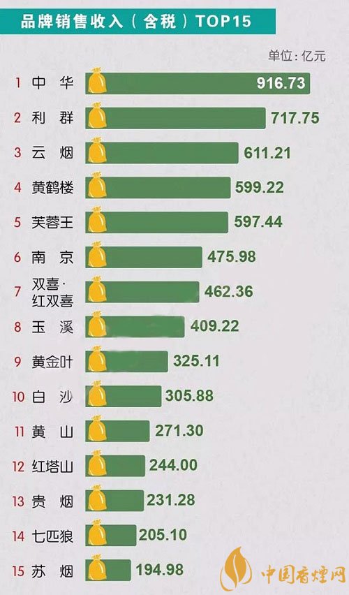 在品牌銷量收入排行榜top5中,中華香煙以900多億的收入當(dāng)之無愧位居榜首,與第二名利群拉開200億的差距,云煙、黃鶴樓、芙蓉王、南京、雙喜紅雙喜、玉溪、黃金葉、白沙、黃山、紅塔山、貴煙、七匹狼、蘇煙分別位居3-15位,第一名中華的收入也是15名蘇煙收入的5倍。
