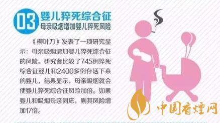 《柳葉刀》發(fā)表了一項(xiàng)研究顯示;母親吸煙增加?jì)雰衡谰C合征的風(fēng)險(xiǎn)。研究者比較了745例猝死綜合征嬰兒和2400多例存活下來的嬰兒,結(jié)果顯示,母親級煙就會(huì)使嬰兒猝死綜合征風(fēng)險(xiǎn)加倍。如果嬰兒和吸煙母親同床,則其風(fēng)險(xiǎn)增加17倍。