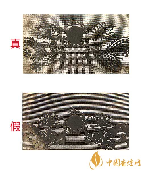 真煙小盒正面龍紋和松枝印刷清晰,色彩飽和度高,有立體感;假煙小盒正面龍紋和松枝印刷模糊,無立體感,且有粗糙圓形圖案。