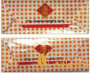 真煙警示語(yǔ)印刷字的邊緣干凈,商標(biāo)紙底色色原點(diǎn)為點(diǎn)狀微小顆粒,印刷細(xì)膩,如警示語(yǔ)第一個(gè)“吸”字的最后一筆捺,起筆點(diǎn)是平頭狀;假煙警示語(yǔ)印刷字的邊緣有均勻的鋸齒狀虛邊,商標(biāo)紙底色色原點(diǎn)為不規(guī)則的點(diǎn),顆粒大,印刷不均勻且粗糙,如警示語(yǔ)第一個(gè)“吸”字的最后一筆捺,起筆點(diǎn)是尖頭狀。