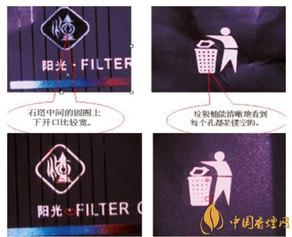 2.真品卷煙小包商標(biāo)紙圖案中,石塔中間的圓圈上下開口比較寬,而假煙一般開口比較窄。
