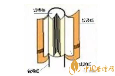 空腔濾嘴:空腔濾嘴是屬于二元復合濾嘴的一種,二元復合濾嘴通常是一段濾材為醋酸纖維,另一段為皺紋紙或生產(chǎn)過程中摻入添加劑(如活性炭)的醋酸纖維??涨粸V嘴是屬于后端為皺紋紙的那種,因為后端為中空,為了不使其塌陷,而醋酸纖維太軟,所以利用皺紋紙做成中空型。因其有一段規(guī)則的空腔, 形成一個低壓通道,抽吸時吸阻小, 能夠顯著提高對煙氣中焦油的過濾效率,有效地減少焦油和一氧化碳的釋放量。