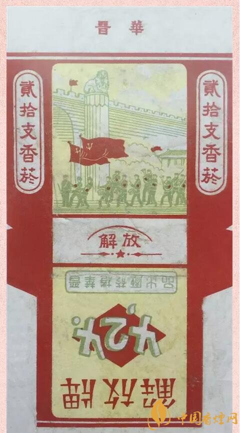 “424”解放牌卷煙 1949年4月24日,中國(guó)人民解放軍攻克了太原。太原戰(zhàn)役規(guī)模龐大,戰(zhàn)況慘烈,是中國(guó)人民解放軍經(jīng)典的戰(zhàn)役之一。山西晉華卷煙廠為紀(jì)念此日,出品“424”解放牌卷煙。煙標(biāo)上面是在太原首義門(mén)前,中國(guó)人民解放軍軍隊(duì)敲鑼吹號(hào)、勝利凱旋的畫(huà)面。