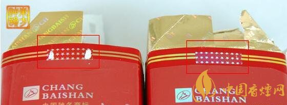 如圖一、圖二白色框標(biāo)注所示,真煙外包裝采用專用紙張印刷,條包和小包圖案及文字顏色一致,顏色光亮、鮮艷,字跡清晰、完整,表面著色均勻、富有光澤,"長(zhǎng)白山"三字凸感明顯。假煙商標(biāo)圖案印刷粗糙、不清晰,文字有偏色、燙金色澤黯淡,字跡不清,表面著色不均,光澤差且模壓圖案或文字凸感不夠。真煙煙盒表面有明顯的豎條紋,假煙則沒(méi)有。