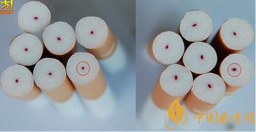 如圖五、圖六紅框標(biāo)注所示,真煙的HCF過(guò)濾纖維(俗稱紅線)位于嘴棒中央,側(cè)面呈規(guī)則圓形,假煙則形狀各異參差不齊。有些假煙,中間的紅點(diǎn)是印刷上去的。