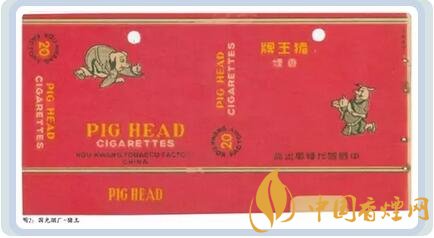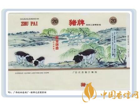 廣西桂林卷煙廠生產(chǎn)過一款豬牌煙標(biāo),圖案是三頭花豬正在春風(fēng)柳綠的村莊外的山地上覓食,包裝上對焦油量、煙氣煙堿量有明確的標(biāo)識。