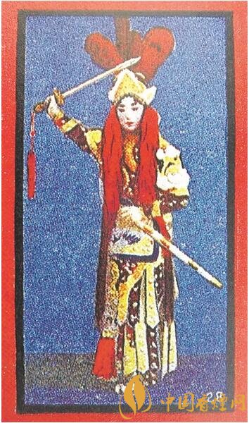 英美煙公司出品的“著名京劇演員劇照”煙畫(huà),70枚一套,其中第28枚為“尚小云之秦良玉”(上圖),為照片版,展現(xiàn)了著名京劇演員尚小云扮演的秦良玉身著戎裝、手持寶劍的形象,背面則印有人名、劇名及演員簡(jiǎn)介。