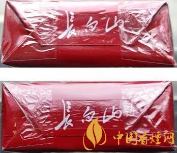 真品卷煙:1.拉線頭形狀為飽滿的半橢圓形。2.透明紙上烙鐵痕跡寬且明顯。3.商標紙超線印刷長白山圖案和logo圖案,側光觀察明亮、清晰。