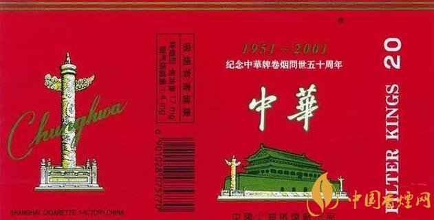 1.二十一世紀(jì):2001年,為紀(jì)念中華牌卷煙問世五十周年,金色的“1951-2001”年號非常顯眼,特制(20支全開式硬卡)這也是全開式中華首次問世。