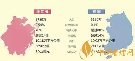 從人口來看,2018年韓國(guó)人口總數(shù)約為5150萬(wàn),自然人口增長(zhǎng)率為0.4%,城鎮(zhèn)化率超過80%。浙江全省常住人口約為5750萬(wàn),自然增長(zhǎng)率為0.54%,城鎮(zhèn)化率接近70%。從人口規(guī)模、人口增長(zhǎng)率來看,浙江略高于韓國(guó),從城鎮(zhèn)化水平來看,又略低于韓國(guó)。這些要素的“差不多”,使得韓國(guó)、浙江卷煙市場(chǎng)容量、城鄉(xiāng)結(jié)構(gòu)、業(yè)態(tài)類型的比較具備了參考性。