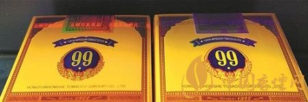 左真右假 真煙中間的“99”圖案,整體偏藍色,色彩過渡自然,呈現(xiàn)中心淺外圍深漸變效果。假煙中間的“99”圖案,色彩無明顯過渡效果,整體偏黑色,套印也不準。