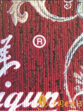 看正面注冊商標(biāo):真煙小盒正面注冊商標(biāo)圖案清晰明亮,外圍輪廓柔和,為完整的圓形,無鋸齒、無斷裂;假煙小盒正面注冊商標(biāo)圖案較為暗淡,外圍輪廓模糊,與背景圖案交疊錯(cuò)印。