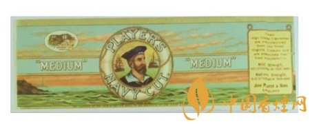 他的背后,兩艘艦艇正乘風破浪,揚帆前行,近處,還有一只金黃色的鐵錨在海面上沉沉浮浮。左上角的橢圓形框內,簡筆畫了些房子和疊幢的碎石,其下寫有英文“NOTTINGHAN CASTLE REGISTERED”的字樣,意思為“諾丁漢城堡”,是它的注冊商標。煙標靠右一隅,是由麻繩結出一個長方形框,內為黃色填充,上書褐色英文字,大意是介紹該水手牌卷煙是來自弗吉尼亞的純真煙草而制作的高級卷煙,其溫和度以紅印記標注,其中醇度以藍印記標注。較為醒目的是由救生圈兩端各引出一根腰際線,上面各寫有“MEDIUM”,即此煙為中醇類卷煙,也就是焦油含量不高。