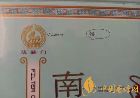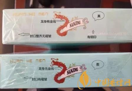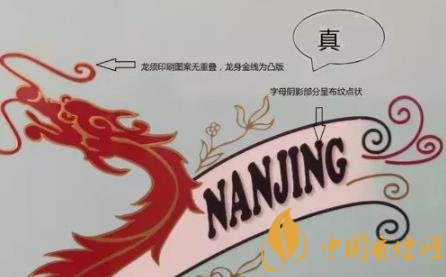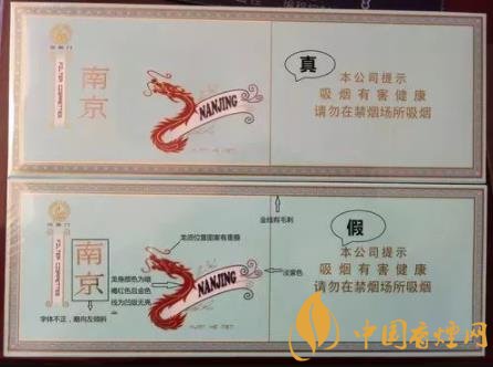 看條盒顏色,真煙為淡藍(lán)色,顏色柔和純正;假煙為淺藍(lán)色,視覺上顏色不是自然色??礂l盒圖標(biāo),真煙“南京”二字字體端正清晰,龍須印刷圖案無重疊,龍身金線為凸版,條盒金邊無毛刺;假煙“南京”二字字體向左微傾,龍須有疊痕錯層,龍身顏色為褐紅色、金線為凹版,條盒金邊有毛刺。