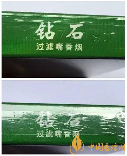 真品卷煙正面的“鉆石”兩字燙金光滑、平整,“荷花”兩字的邊緣為豎條紋狀的白色印刷;假煙正面的“鉆石”兩字的燙金呈豎條紋狀,“荷花”兩字的邊緣為光滑的白色印刷。