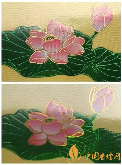 真品卷煙商標(biāo)紙上的荷花花瓣采用漸變技術(shù),顏色由粉紅色向白色過渡,花蕊處金色線條清晰,圖案印刷自然協(xié)調(diào),立體感強(qiáng);假煙采用普通仿制技術(shù),顏色搭配較為死板,花蕊處金色線條模糊、擠成一團(tuán),圖案印刷粗糙、立體感差。