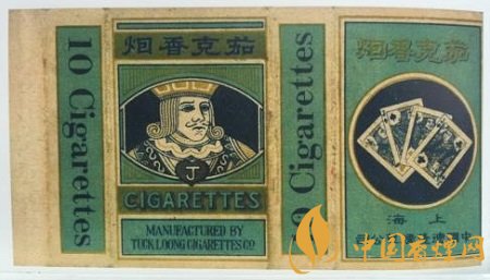 整幅煙標由湖綠顏色擔當主色調,配以藏青色和金色,輔以撲克牌不同花色圖案形成的彩色,洋味很濃,幾可亂真是舶來品。10支裝的卷煙規(guī)格,在當時是頗為流行且較普遍的一種卷煙規(guī)格。