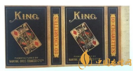 二十世紀三十年代,南洋兄弟煙草公司出品了“王牌”卷煙。這張煙標長146MM,寬74MM。“王牌”即“KING”,撲克牌“K”牌面。該卷煙標正版與副版的圖案一模一樣,煙標中央向左傾斜45度的一張方塊“K”撲克牌,其上寫有大大的金色英文字母“KING”,其下為南洋兄弟煙草公司出品的英譯文。整幅煙標沒有一個中文字,左右騎縫處則各印有紅色的“10 CIGARETTES”,即該卷煙規(guī)格為十支裝。方塊“K”牌面,就是凱撒大帝(朱利葉斯·凱撒),為羅馬共和國終生的執(zhí)政官,后出任高盧總督。四張花色的“K”牌面,南洋公司為何只取其方塊花色呢?因為在四張花色“K”中,只有這張方塊“K”為凱撒大帝手持戰(zhàn)斧的側面像,其余三張人物均為正面像。可能廠商是為了標新立異,從中亦能投射出其生產的卷煙與眾不同吧。如此設計的煙標,握于手掌,更像是拿了一副撲克牌,雌雄難辨,頗有玩味。