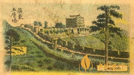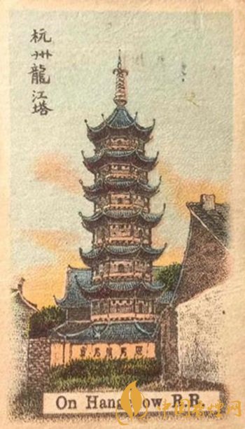 浙江杭州龍江塔何時始建暫時無考,從畫面上可以看出是一座七級八面的精美古塔。可惜,現(xiàn)在這座古塔已蕩然無存,我們也只能從這張小小的煙畫上來領略這座古塔的風韻。