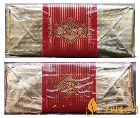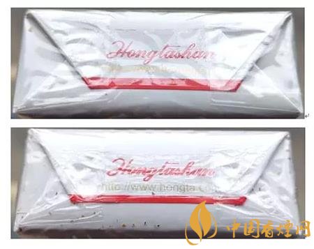 假冒卷煙:1.透明紙燙封收縮雜亂、死板,水汽較重。2.商標(biāo)紙拐角折疊緊實(shí),無(wú)空隙。(上真下假)