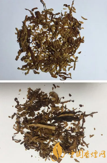 真品卷煙煙絲呈金黃色、絲條狀,煙絲結(jié)構(gòu)為純?nèi)~絲,香氣醇厚;假煙煙絲呈棕黑色,含末量大,煙梗較多,香精氣味濃烈。