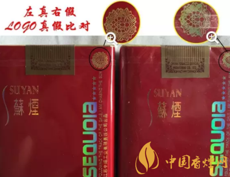 左邊的香煙煙盒是真的,蘇煙logo旁邊的字體色澤也是不一樣的,而右邊的香煙就是呈金色,顏色也沒有左邊的香煙那么醒目。