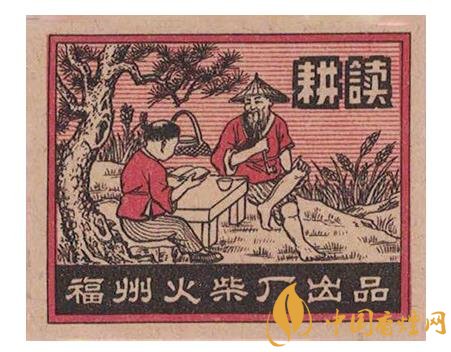 而福州火柴廠出品于1954年的“耕讀”(圖4)火花,則表現(xiàn)了一位頭戴斗笠的老農(nóng)在春耕間隙,翹著二郎腿坐在田邊青松下的石頭上,胳膊肘斜放于在石桌,面帶微笑,抽著旱煙陪伴孫兒讀書(shū)的場(chǎng)景。再看老農(nóng)身后的簍子,以及桌上的碗筷,似乎是描寫這個(gè)老農(nóng)在吃完孫子給送的飯后,不忘“耕讀傳家”祖訓(xùn),利用吃飯休息間隙,輔導(dǎo)孫子多學(xué)點(diǎn)知識(shí)。