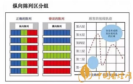 縱向陳列較橫向陳列更符合顧客視線軌跡的運(yùn)行,能最大限度地提升顧客對排面的關(guān)注,避免顧客視線死角的形成。如下圖: