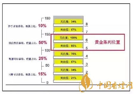 在同一組貨架上,因為顧客注視的方式不同,所以不同陳列位置產生的銷量會有不同的變化,一般來說,與視線平齊的位置陳列的商品銷量最高,而顧客需要仰望和蹲下才能注視的商品銷量相對要低。