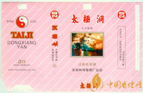 而安徽蚌埠卷煙廠出品于上世紀80年代的“太極洞”套標,副版也繪有一幅太極圖,主版圖案分別是位于安徽廣德縣東北石龍山太極洞內(nèi)的“太上老君”“金龍盤玉柱”“大千世界”“壺天宮”“三清池”5處自然景點。