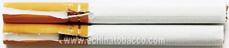 煙支過濾嘴及煙絲差異對(duì)比:真煙煙支采用單一醋纖濾嘴,長(zhǎng)度為24mm,煙絲切絲寬度均勻,煙絲疏松、光澤油潤(rùn)性好、呈檸檬黃色,煙絲結(jié)構(gòu)為葉絲、膨脹梗絲和造紙法再造煙葉;假煙煙支過濾嘴較短,長(zhǎng)度約為20mm,制絲工藝粗糙,色澤發(fā)暗無光澤、煙絲中含碎末較多,大量梗絲未經(jīng)過膨脹處理,無造紙法再造煙葉,與真品特征存在明顯差異。