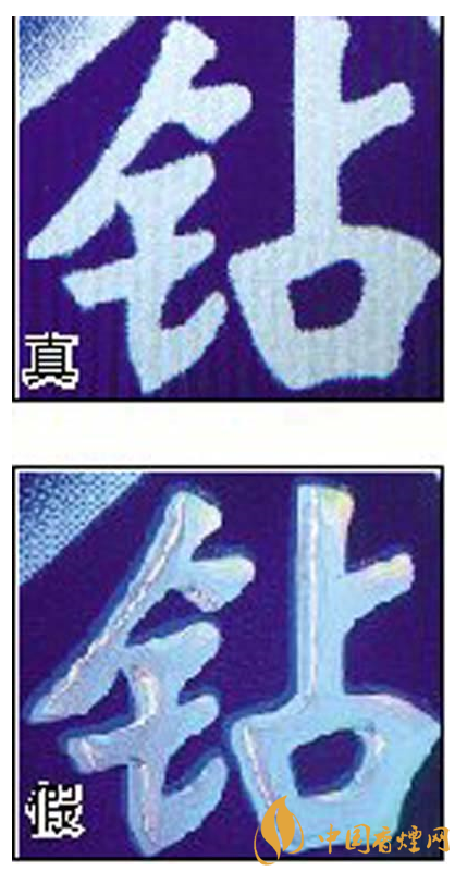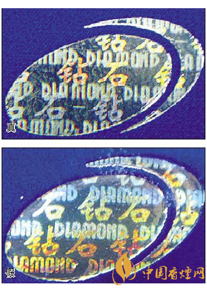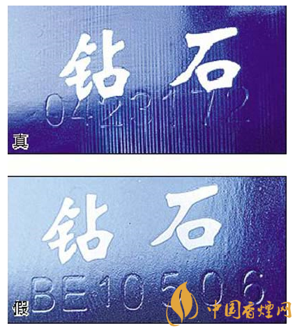 五看鉆石圖案:真煙鉆石圖案印刷清晰,色彩感強,內有微縮英文字母“DIAMOND”,圖案無凹凸感;假煙印刷不清晰,用手摸上去有凹凸感。