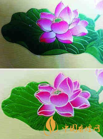4.看小盒正面荷花logo圖案,真品鉆石荷花,該處是采用凹凸燙金技術印刷,“荷花”圖樣立體感明顯,尤其是花蕊位置清晰;而假煙是采用高清照相掃描進行仿制,logo圖案套色、燙金不準確,花蕊位置模糊。