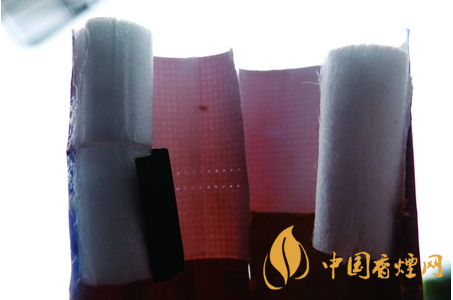 煙支濾嘴棒及降焦打孔差異比對(duì):真品煙支濾嘴棒采用新型降焦“二元復(fù)合炭紙過(guò)濾嘴棒”,長(zhǎng)度24(12+12)mm兩段式組合,接裝紙上有兩排降焦打孔;假煙濾嘴棒采用單一丙纖材質(zhì)的濾嘴,長(zhǎng)度只有19mm,接裝紙上無(wú)任何打孔,無(wú)法達(dá)到物理降焦效果,與真品工藝特征存在明顯差異。