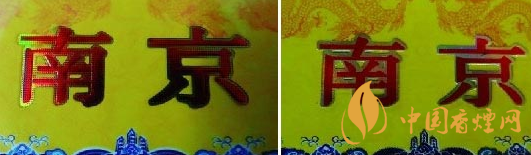 小盒商標(biāo)紙印刷工藝差異比對:真品卷煙小盒商標(biāo)紙“南京”字體印刷由無數(shù)個相等小圓點(diǎn)組合而成且立體感強(qiáng),印刷工藝水平技術(shù)含量高,不易被仿制印刷;假煙小盒商標(biāo)紙“南京”字體采用普通仿制套印燙金工藝,字體沒有立體感和線條層次感,套印燙金工藝粗糙且邊緣有毛渣,與真品印刷工藝差異明顯。