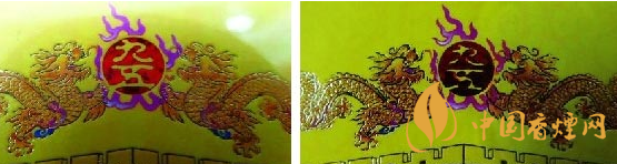 小盒商標(biāo)紙燙金套印工藝差異比對:真品卷煙小盒商標(biāo)紙雕刻燙金套印工藝,龍鱗顏色均勻一致,龍珠里“九五”兩字燙金字體飽滿;假煙印刷工藝仿制粗糙,龍鱗顏色失真,龍珠里“九五”套印不準(zhǔn),字體邊緣有明顯脫漆掉色現(xiàn)象,與真品呈現(xiàn)效果差異明顯。