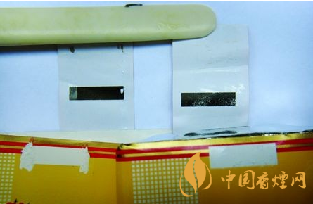 二、小盒頂部封簽?zāi)z水痕跡差異比對:真品小盒封簽均為機(jī)器上膠,上膠均勻且有規(guī)則;假煙多為手工涂膠痕跡,上膠無規(guī)則,與真品卷煙工藝比對存在明顯差異。