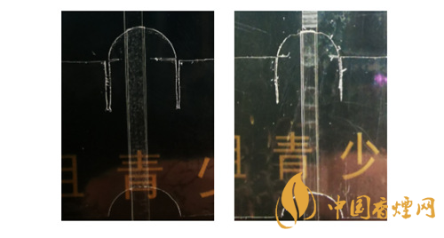 真品卷煙:條盒兩端透明紙上隱約可見卷煙包裝機烙鐵留下的燙封痕跡;底部透明中間位置紙收縮平整、緊實,兩側透明紙收縮自然;鋼印隱約可見力度大小不同,不清晰。
