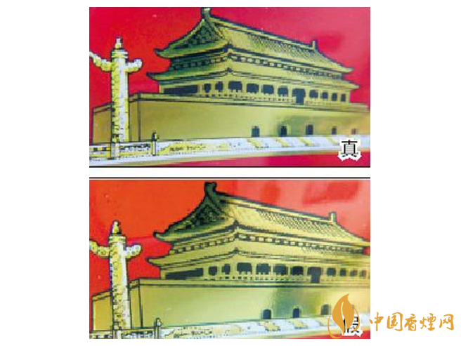 1.小盒正面商標紙?zhí)咨珷C金工藝對比:真煙天安門左側華表套色均勻,黃白色分布有明顯分界點,邊緣光滑、干凈、清晰;假煙套色較差,黃白色不明顯,黃色部分印刷較分散,字體邊緣套印有毛渣點,呈現(xiàn)鋸齒狀。