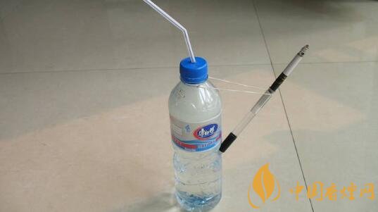 第三步:裝上大半瓶子清水,一個(gè)水煙就做好了。用嘴從一側(cè)軟管吸氣的時(shí)候,瓶子里的空腔氣壓降低,在大氣壓的作用下,空氣從裝有香煙的軟管進(jìn)入,經(jīng)過(guò)瓶子里清水的過(guò)濾,最后被吸進(jìn)人嘴里,這一步在怎么自己做水煙中最為詳細(xì)。