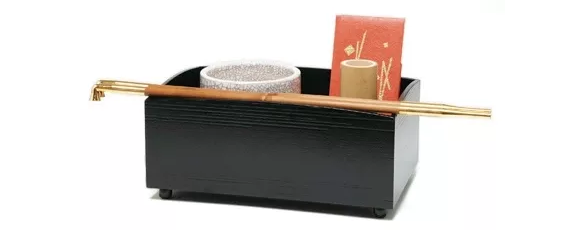 武者小路千家與表、里千家最大的區(qū)別:就是會(huì)使用香箸,香箸放在灰吹的右手邊。